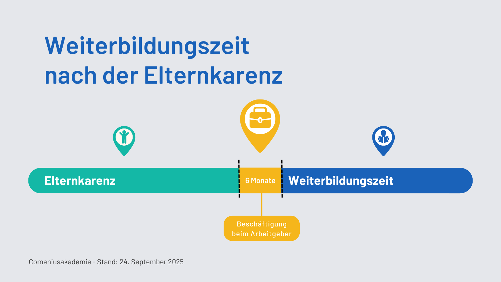 Wer aktuell noch in Elternkarenz ist, hat keinen sicheren Anspruch mehr, direkt in eine klassische Bildungskarenz/Weiterbildungzeit überzugehen (mit Förderung), denn das System ist abgeschafft bzw. wird reformiert. Dazwischen muss eine Beschäftigungsphase von 26 Wochen liegen. Viele Details des neuen Modells sind noch nicht gesetzlich fixiert, sie befinden sich derzeit in der Begutachtungsphase. Diese Informationen basieren auf dem aktuellen Gesetzesentwurf. Die endgültige Rechtslage steht noch nicht fest, da der Entwurf derzeit geprüft wird. Die Begutachtungsfrist läuft bis zum 29. September 2025. Hier weitere Informationen zur Weiterbildungszeit nachlesen.